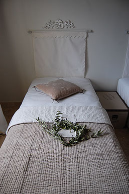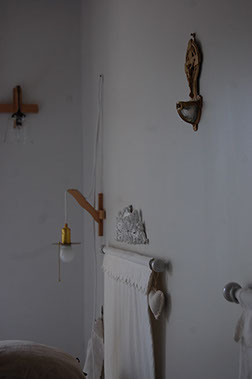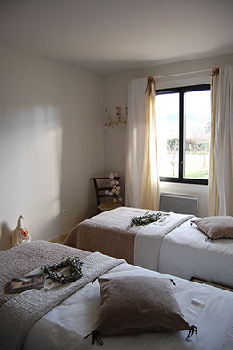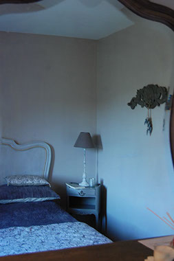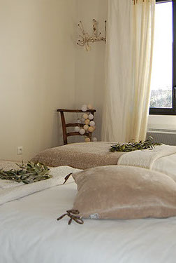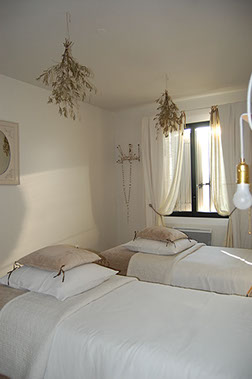 Épurée, blanche et sereine, neutre et reposante, le lieux de repos offre deux lits en 90. C'est dans les draps en lin de nos grands-mères que vous dormirez, reconvertis en housse de couette, en petits sacs ou encore en taies d'oreillers... De la fenêtre, communiez avec la Sainte Baume et laissez-vous porter par le charme de cette douce cellule monacale...