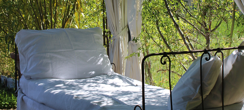 Pure, nature, Forest est rudimentaire et brute. Rien n'entravera votre repos dans ce domaine apaisant qui offre la douceur et la simplicité des bois. De la fenêtre, respirez les vieux arbres du verger... Drap et édredon en lin brut, couvre lit velours En fil d'Indienne habillent un lit en 160.